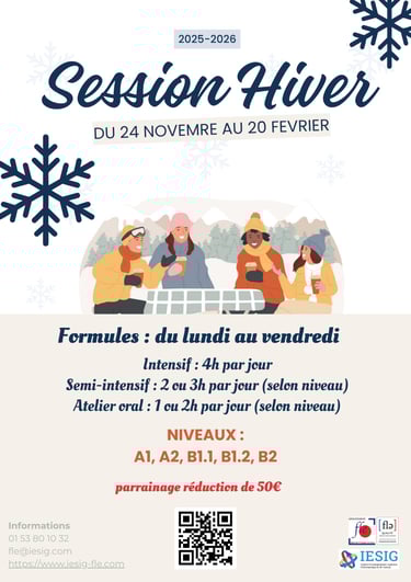 Organización del curso: 20 horas de clase por semana (15h de francés general + 5h de taller 'Atelier' para A1 y A2 o 10h de francés general + 10h de taller 'Atelier' para B1, B2, C1)