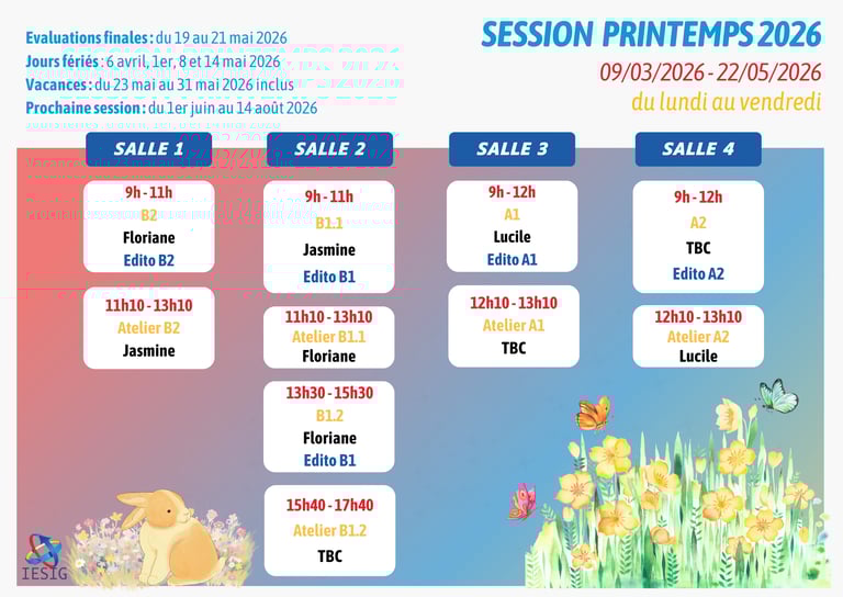 Chez IESIG-FLE, nous croyons fermement que la clé de la réussite dans l'apprentissage d'une nouvelle langue réside dans une planification minutieuse et une gestion efficace du temps. C'est pourquoi nous mettons à votre disposition un calendrier de cours détaillé, conçu pour vous aider à tracer votre parcours vers l'excellence linguistique.