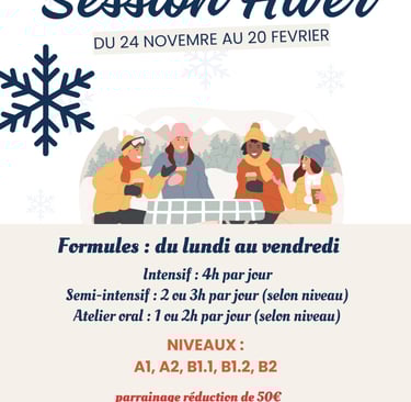 초보자이시고 프랑스어를 한 번도 공부한 적이 없다면, 세션의 시작 부분에서 시작하시기를 권장합니다(일정을 참조하십시오). 그러나 더 높은 수준의 학생들은 매주 월요일에 환영하며, 진행 중인 수업에 참여할 수 있습니다.
