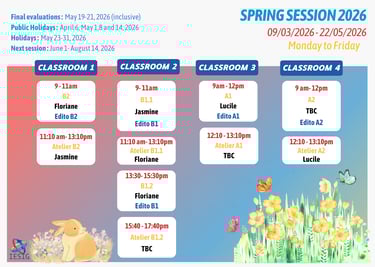 IESIG-FLE는 새로운 언어를 배우기 위한 성공의 열쇠는 신중한 계획과 효과적인 시간 관리에 있다고 굳게 믿습니다. 그렇기 때문에 언어적 우수성을 향한 과정을 계획하는 데 도움이 되도록 상세한 코스 시간표를 제공합니다.