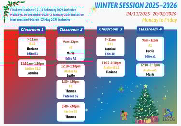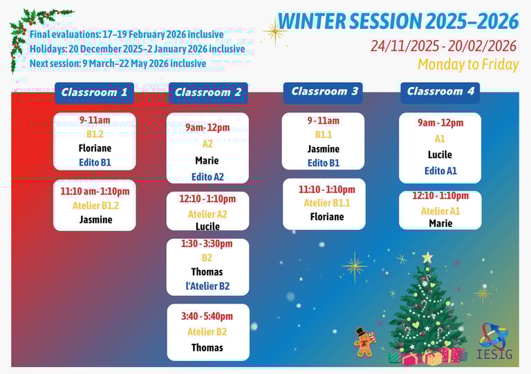 Добро пожаловать в увлекательный мир изучения иностранных языков в нашей знаменитой школе! В IESIG-FLE мы твердо убеждены, что залог успеха в изучении нового языка - это тщательное планирование и эффективное управление временем. Именно поэтому мы предоставляем Вам подробное расписание занятий, которое поможет Вам наметить свой путь к языковому совершенству.