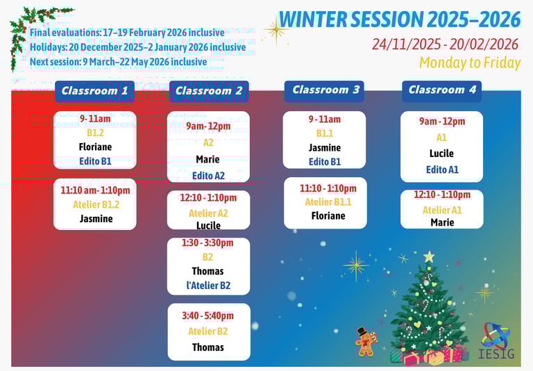 В IESIG-FLE мы считаем, что каждый шаг на пути изучения языка имеет огромное значение. Предоставляя Вам беспрепятственный доступ к расписанию наших курсов, мы хотим помочь Вам сосредоточиться на обучении без лишних административных хлопот.
