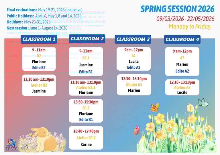 At IESIG-FLE, we firmly believe that the key to success in learning a new language lies in careful planning and effective time management. That's why we provide you with a detailed course timetable, designed to help you chart your course towards linguistic excellence.