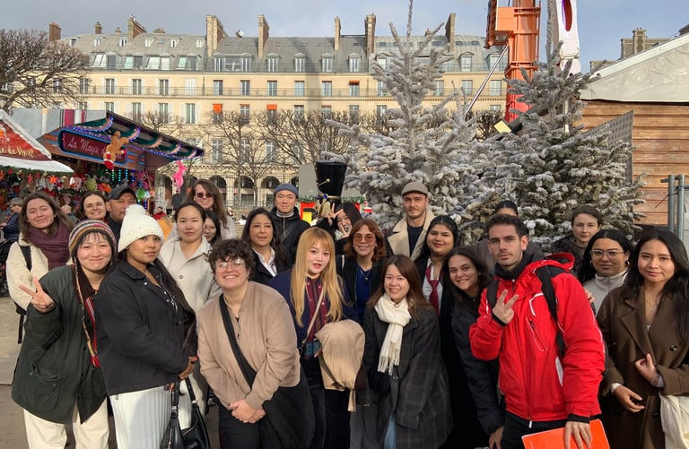 2025年12月10日,我们巴黎成人法语学校的A1和A2级别的学生参加了一次在首都中心的教育参观活动。作为法语作为外语(FLE)课程的延伸,这次活动让学员们能够在文化和节日氛围中练习法语,同时探索巴黎一些最具标志性的地标。